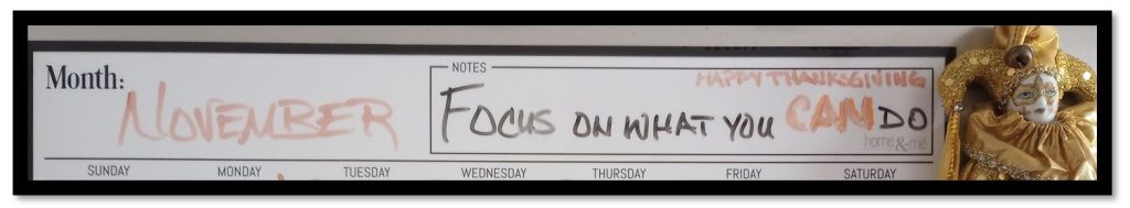 When I feel upset or afraid, I walk to my fridge and look at my calendar and look at my note, “Focus on what you CAN do.”